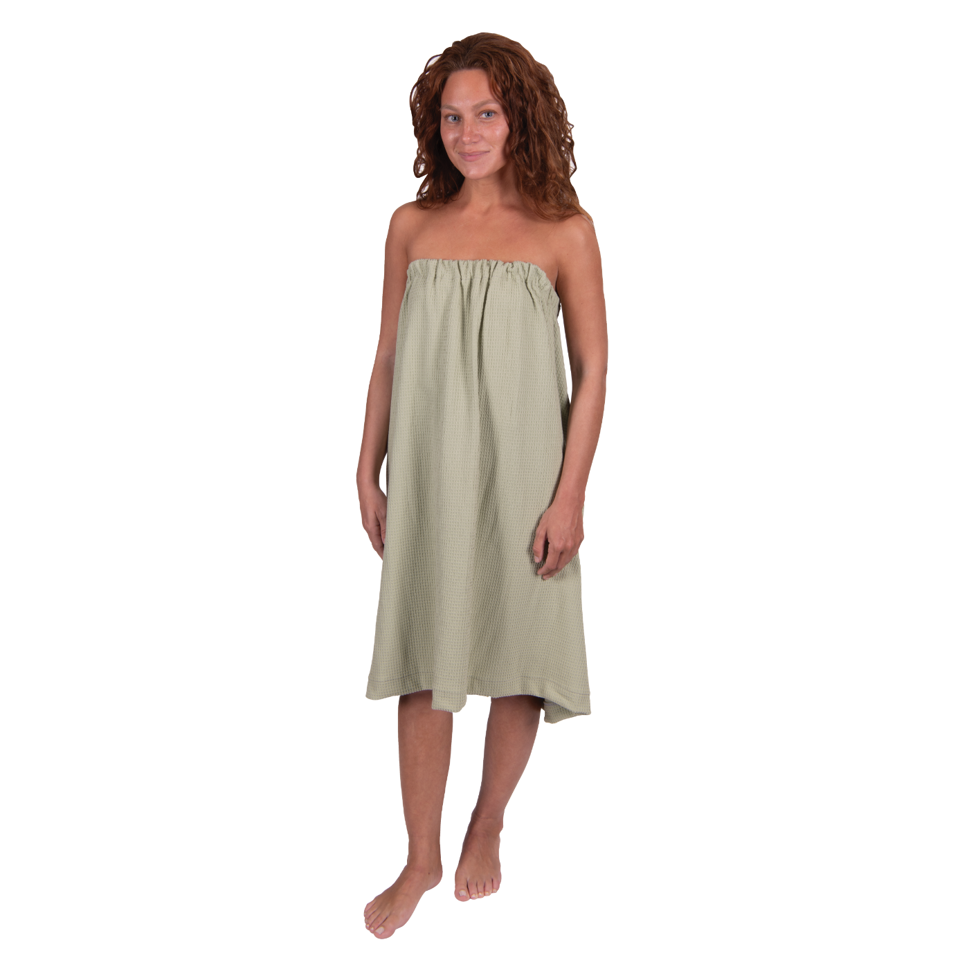 Soft, waffle weave wrap has an elastic top and Velcro closure to provide full coverage for spa services.