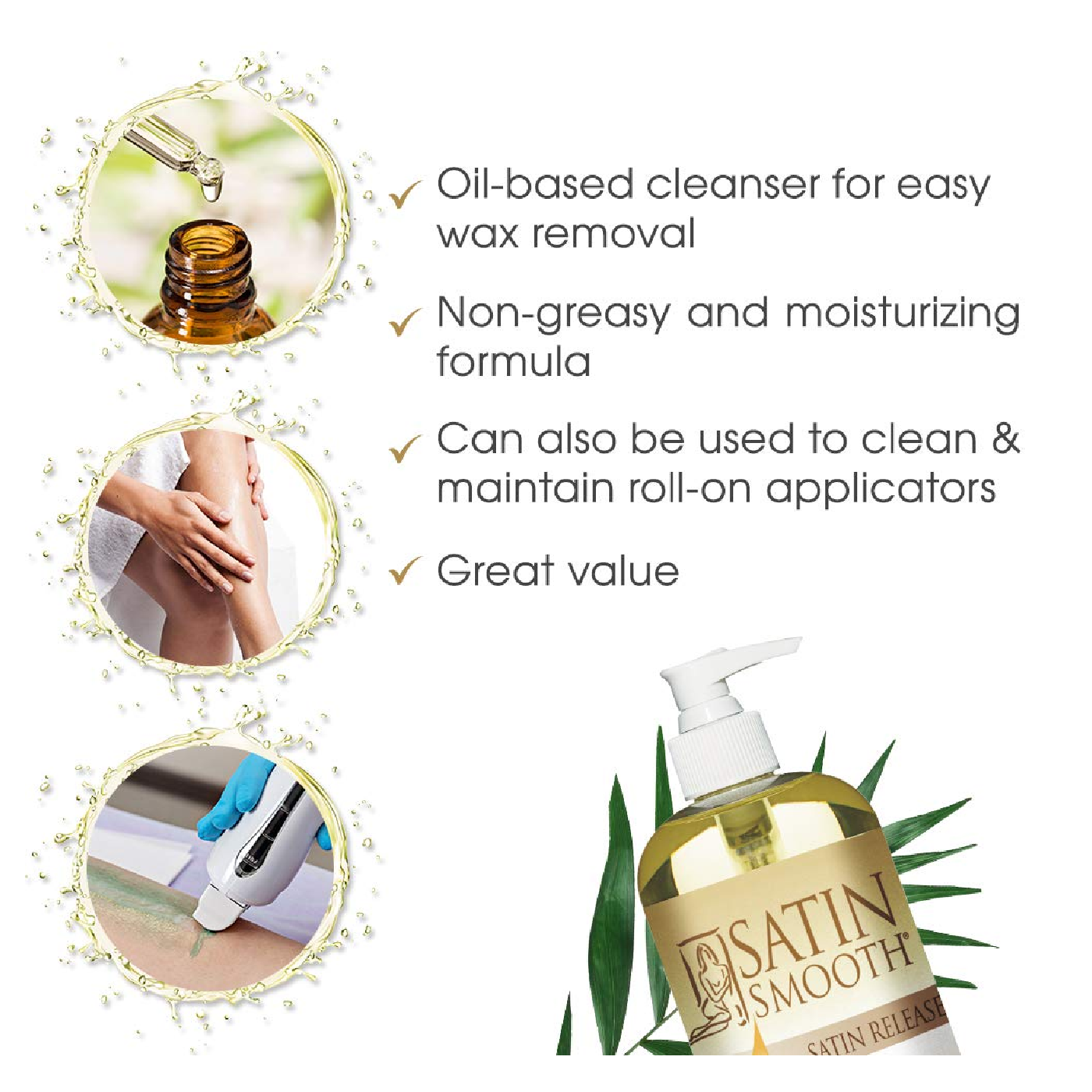 - Clear Skin Effective Wax Remover: Say goodbye to leftover hair removal wax with the Satin Release?? Wax Residue Remover. This effective and gentle oil-based wax remover eliminates all traces of wax as it helps soothe and moisturize the skin. The perfect finishing touch after your sensational hair removal waxing sessions with your favorite Satin Smooth hard and soft wax choice!